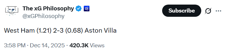 So what? It doesn’t say Villa should have lost by half a goal any more than they should be 15th. It’s useful long-term data wrapped up in immediate guff and it barely scratches the surface in terms of misrepresenting xG for public consumption.